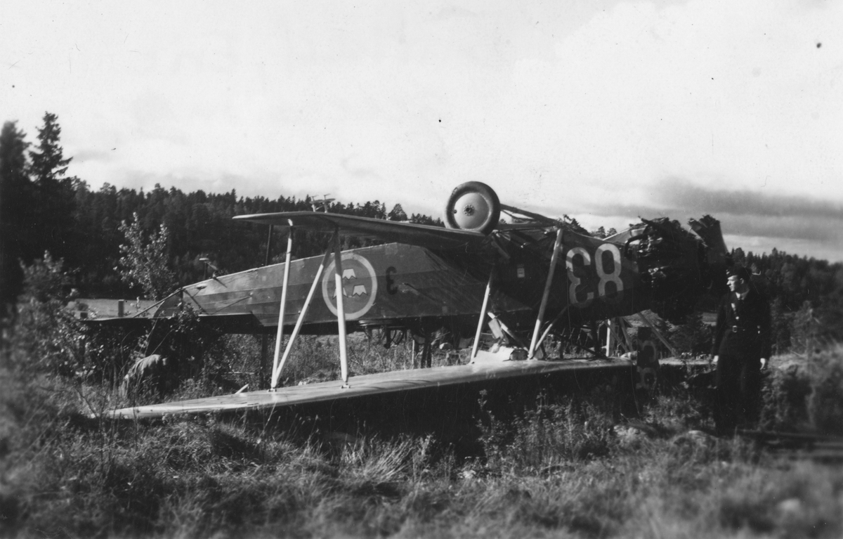 Haveri av flygplan S 6 märkt med nummer 83 i terräng. Flygplanet har slått runt och hamnat uppochned.