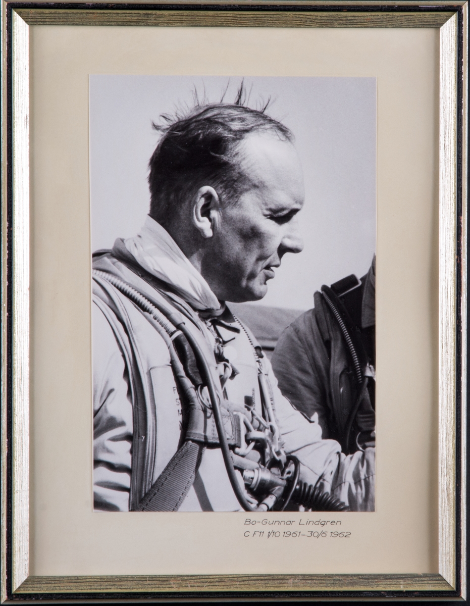Porträttfotografi av Bo-Gunnar Lindgren, chef för F 11 Södermanlands flygflottilj 1961-1962, i flygarkläder. Inramat foto.