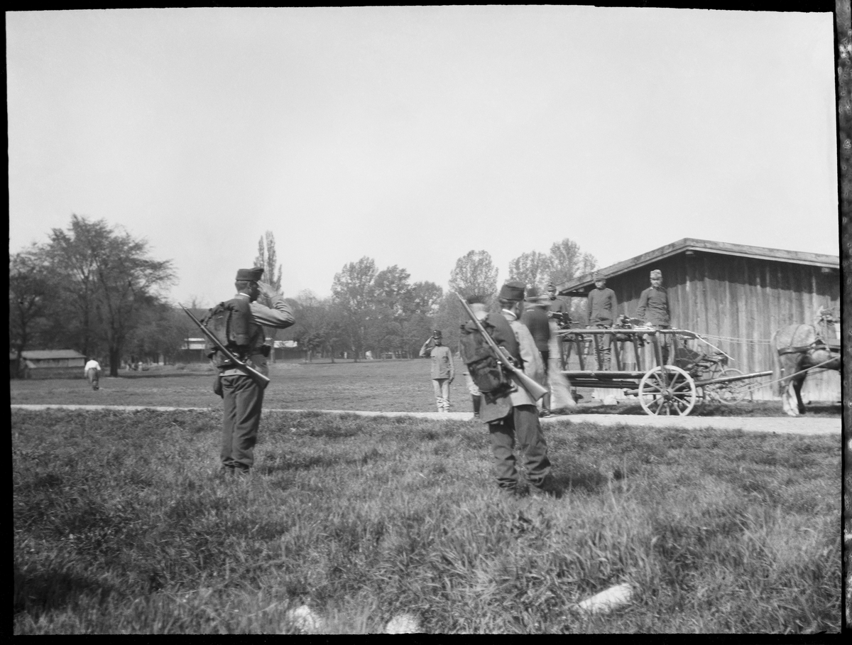 Militärer från Österrike-Ungern under första världskriget. I förgrunden syns ryggarma av två soldater. I bakgrunden står ett hästekipage med soldater och en kulspruta på vagnen.