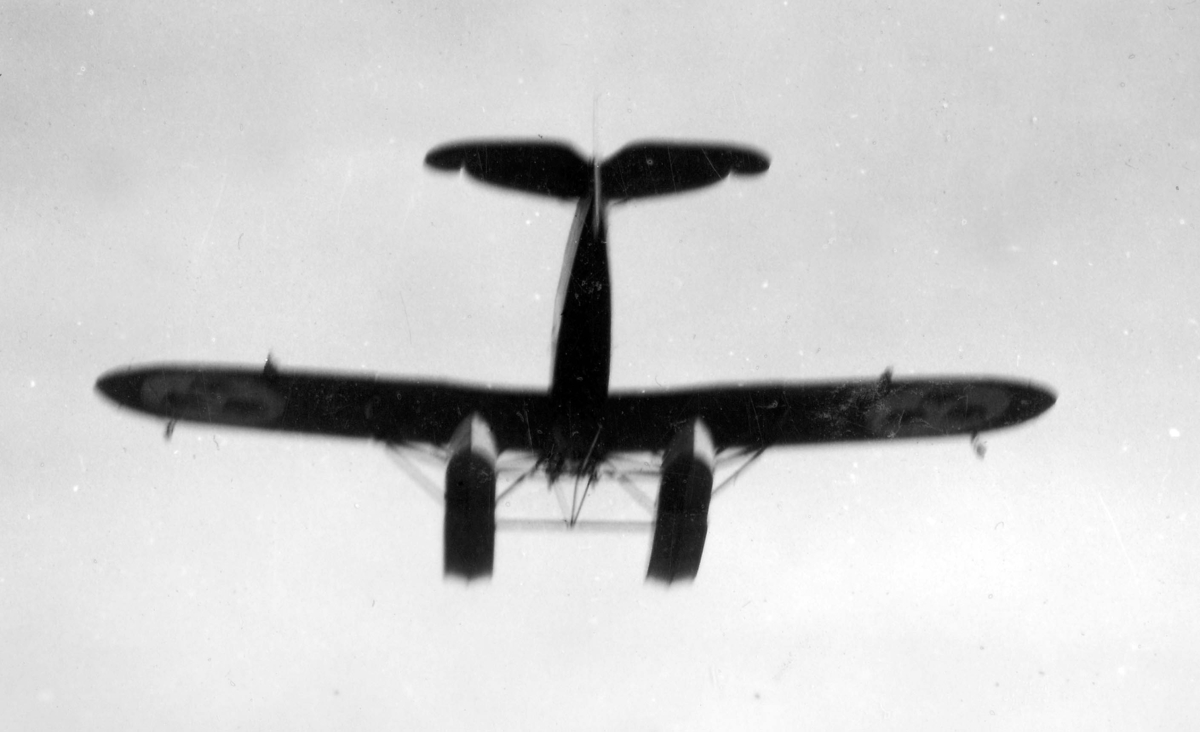 Flygplan S 5 i luften. Flygbild taget snett nedifrån från ett annat flygplan. 1930-tal.