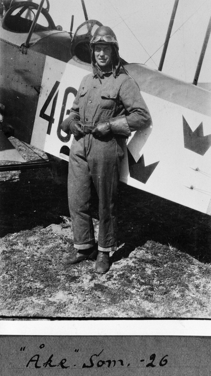 Militäre flygaren Åke Fredin står framför flygplan FVM Albatros på flygfältet på Malmen, sommaren 1926.