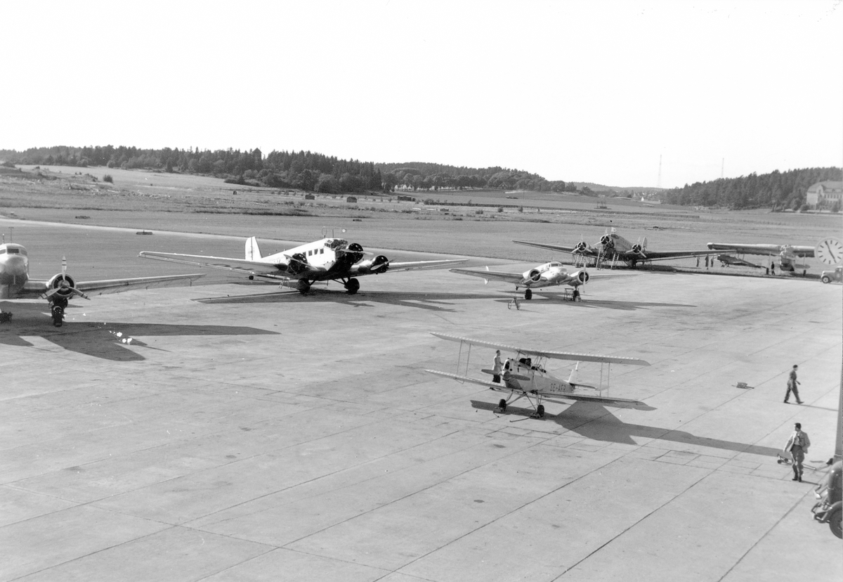 Ett flertal flygplan av Junkers-typ står på Bromma flygplats. Vy ovanifrån. Människor i rörelse.