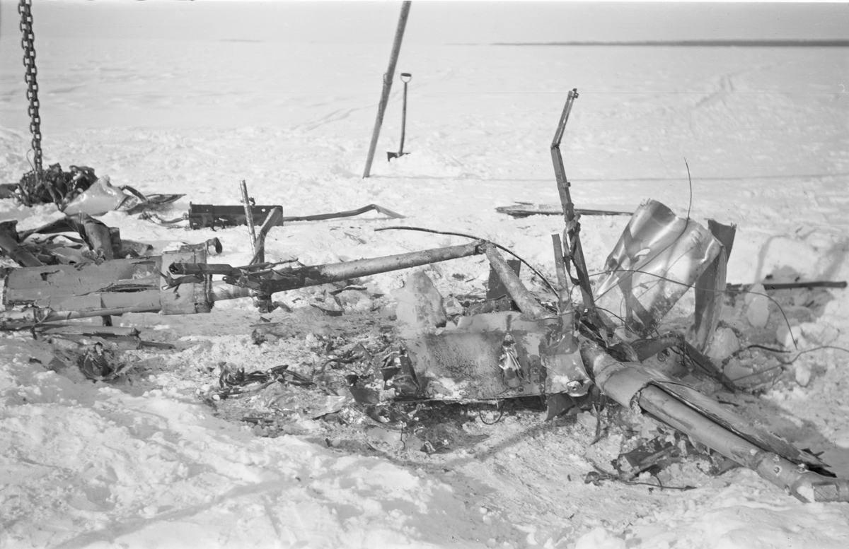 Vrak efter havererat flygplan J 8 Gloster Gladiator nr 274, märkt gul D vid Svenska frivilligkåren i Finland, F 19.