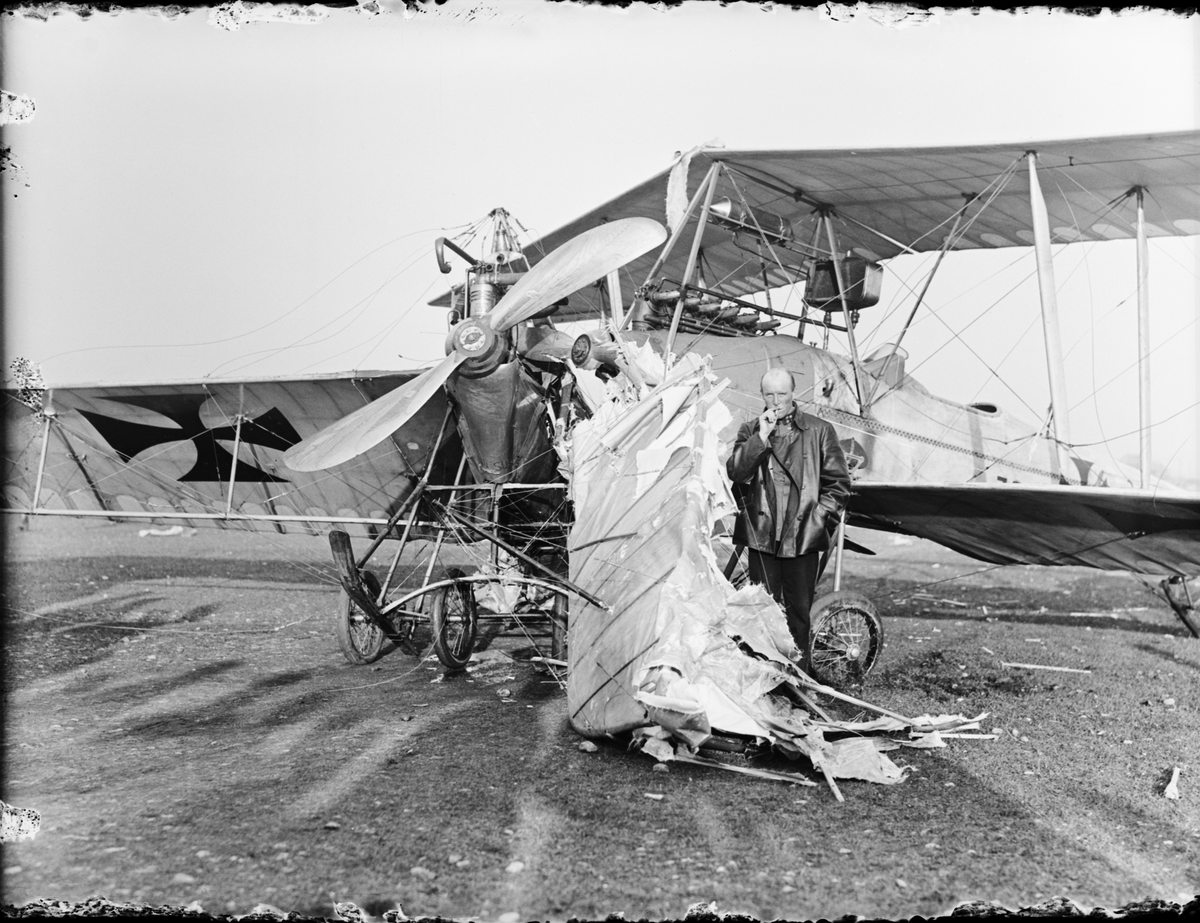 En flygförare står vid flygplansvraken efter kollision mellan militärt flygplan Lohner B.I märkt 72.17 tillhörande Österrike-Ungern och flygplan Etrich Type F. Vy framifrån.