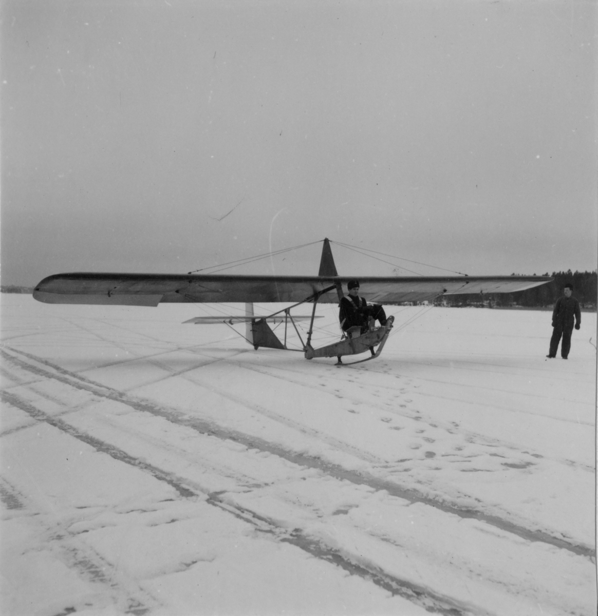 Flygning med glidflygplan G 101 vintertid år 1944. På F 2 D, Roslagens flygflottilj, vintertid. Flygplan med förare på isen.