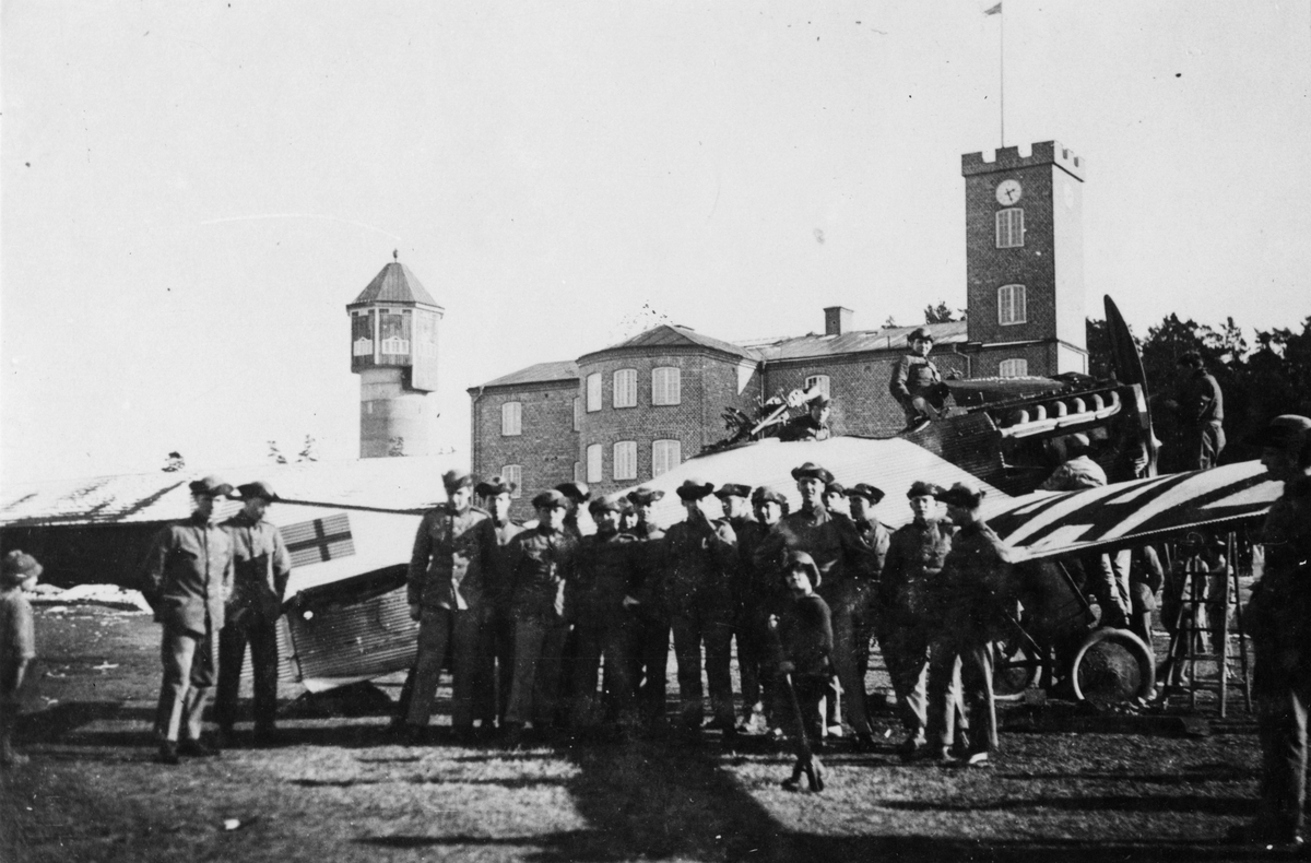 Militärer och en pojke samlade framför ett civilt flygplan vid Centrala flygverkstäderna i Malmslätt, 1920-tal. 20-30 män.