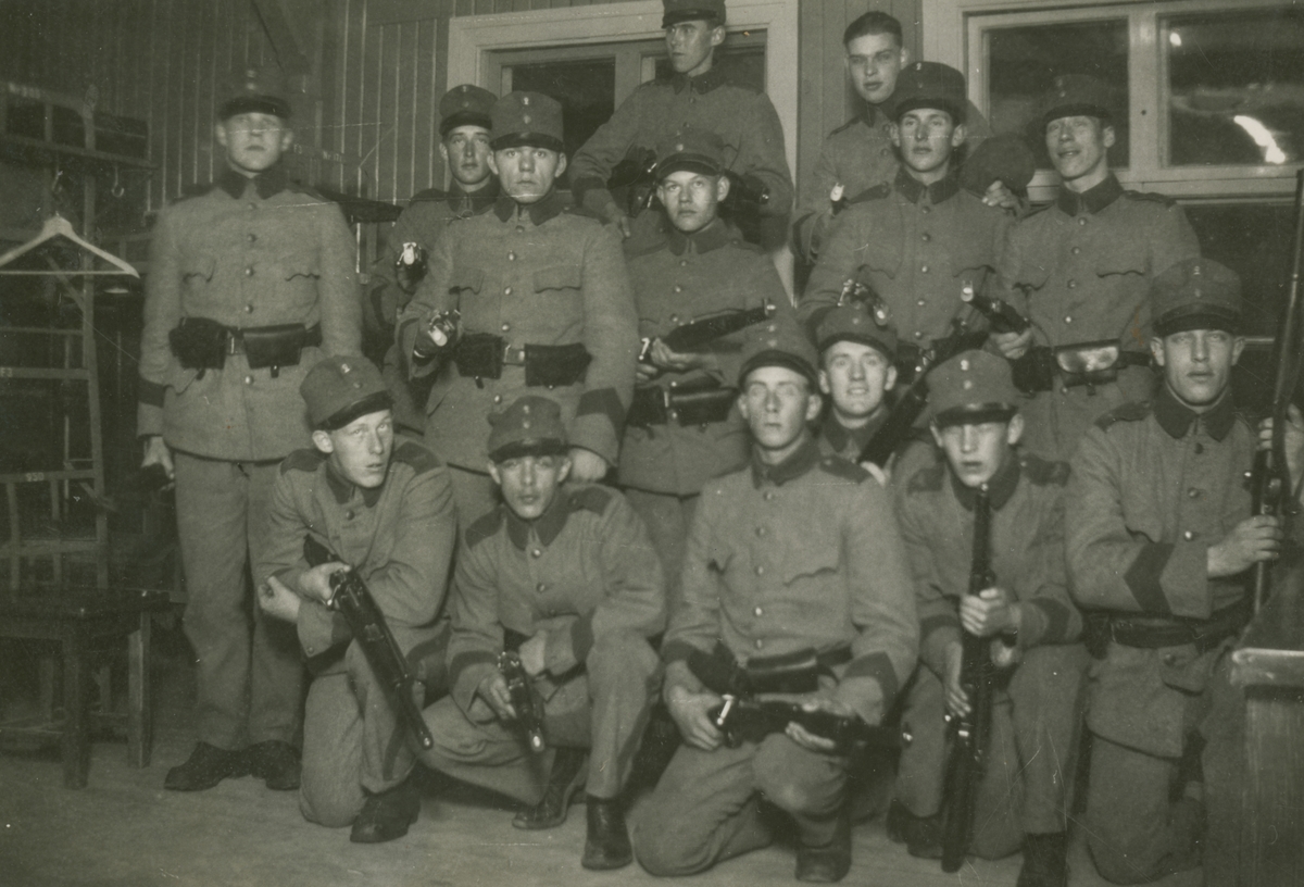Grupporträtt av värnpliktiga soldater på F 3 Malmen, 1927-1928. 14 beväpnade män i uniform uppställda i logemente.
