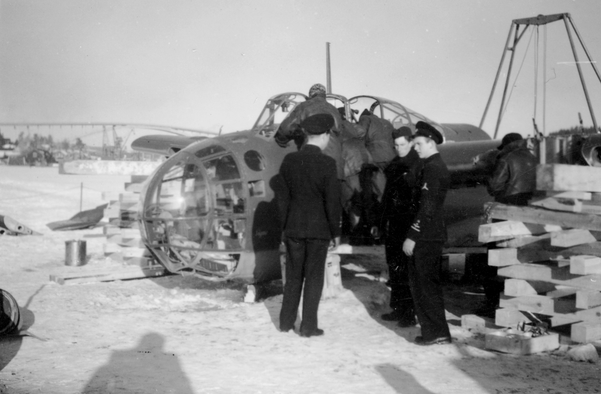 Flygtekniker och flygvapenpersonal samlade vid bärgat flygplan B 18 på kajen i Härnösands hamn efter nödlandning på isen den 10 februari 1946. Motorerna har demonterats. I bakgrunden syns en lyftkran som användes vid bärgningen.