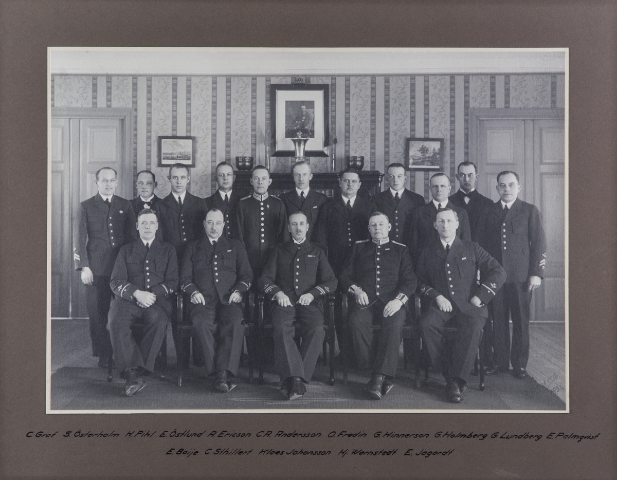 Grupporträtt av militärer vid F 3 Malmen, 1936. Interiör.
