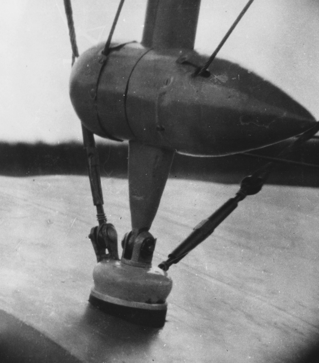 Närbild av infästning av bakre yttre vingstötta med wirestag på ett flygplan Albatros.