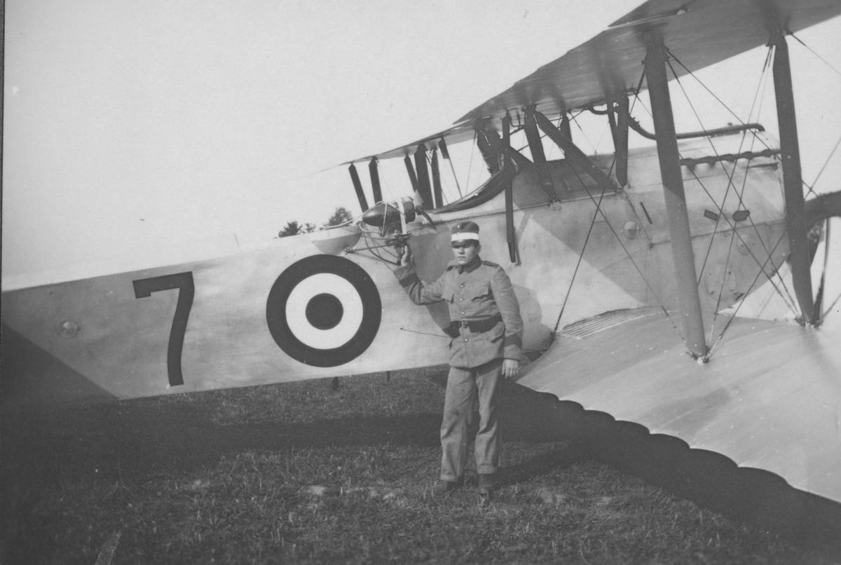 Porträtt av värnpliktig man vid ett militärt propellerflygplan på ett flygfält.