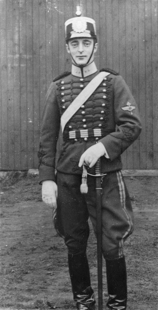 Porträtt av militäre flygföraren Carl Florman, från Svea artilleriregemente, ståendes framför en vägg.