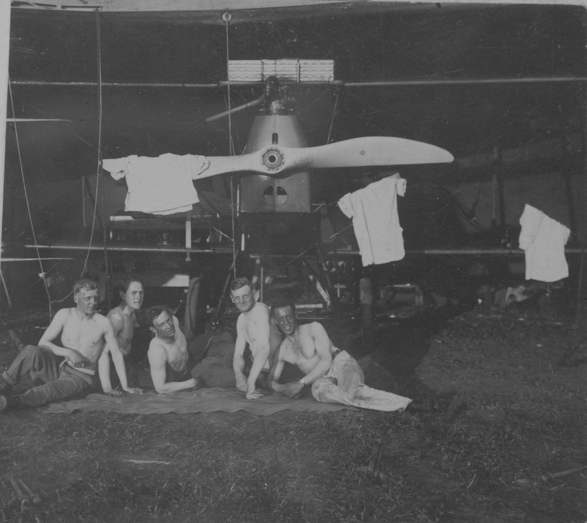 Sommardag. Fem män med bar överkropp sitter framför ett flygplan i en hangar på Hästholmens flygfält, 1923. På flygplanspropellern hänger tröjor.