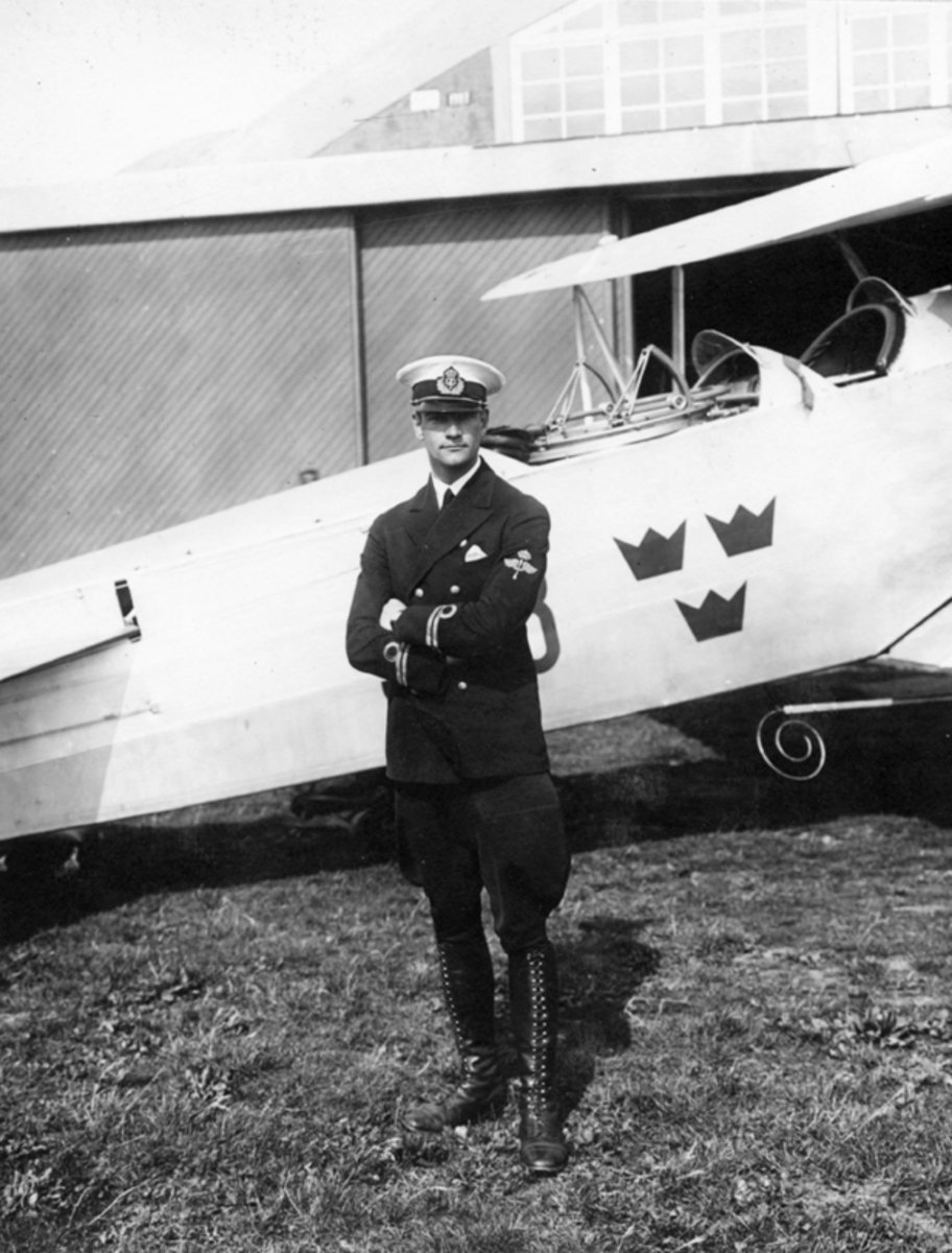 Porträtt av löjtnant framför flygplan S 6 på Malmen.
