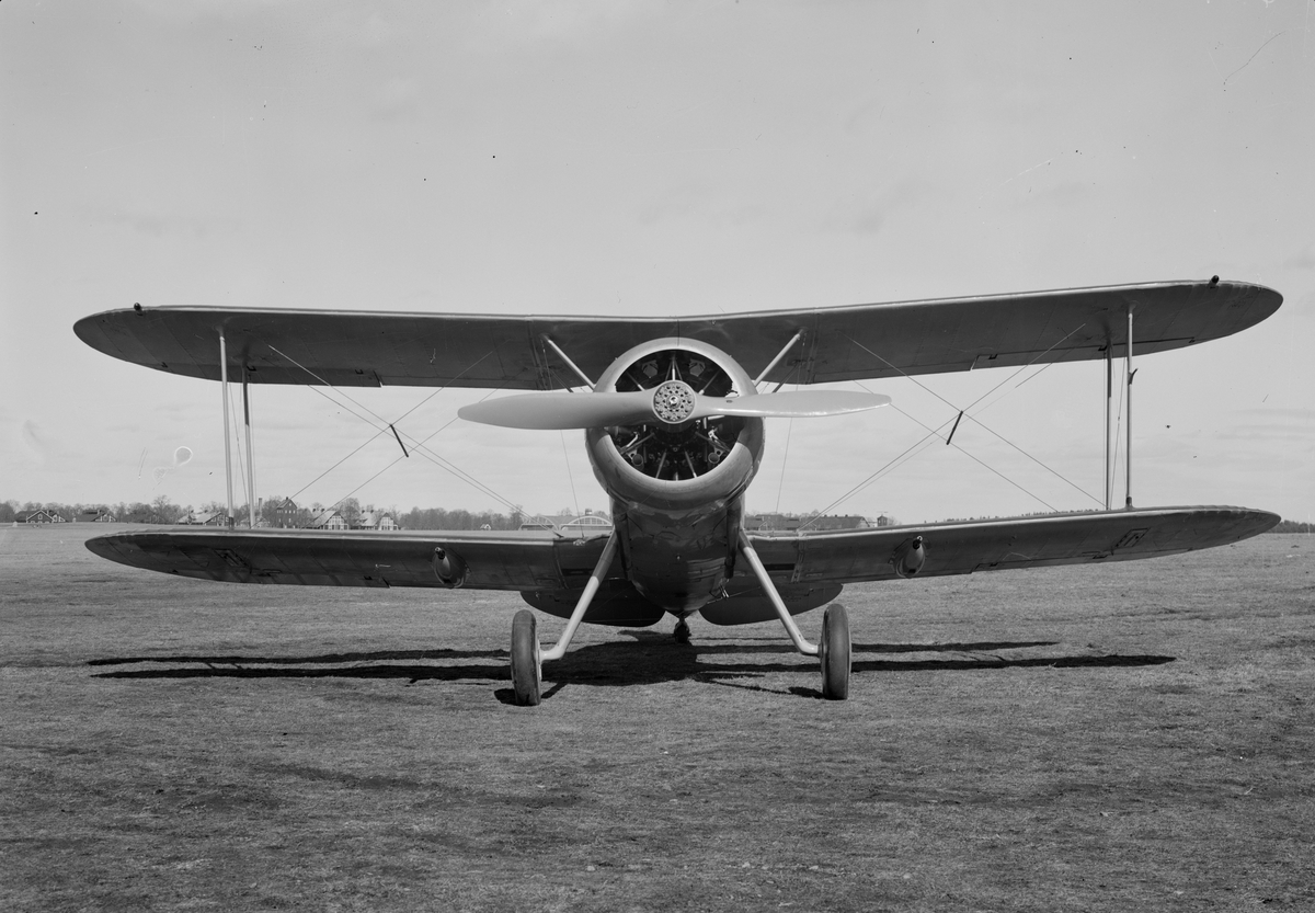 Flygplan J 8 Gloster Gladiator märkt 6 står på Malmens flygfält. Vy framifrån.