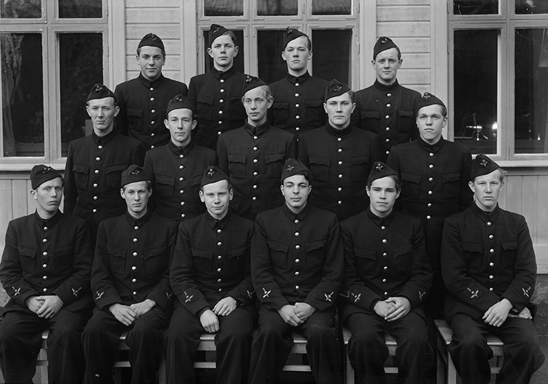 Elever vid vicekorpralskolan på F 3 Östgöta flygflottilj, 1944-1945. Del av klass, 15 elever. Grupporträtt framför byggnad.