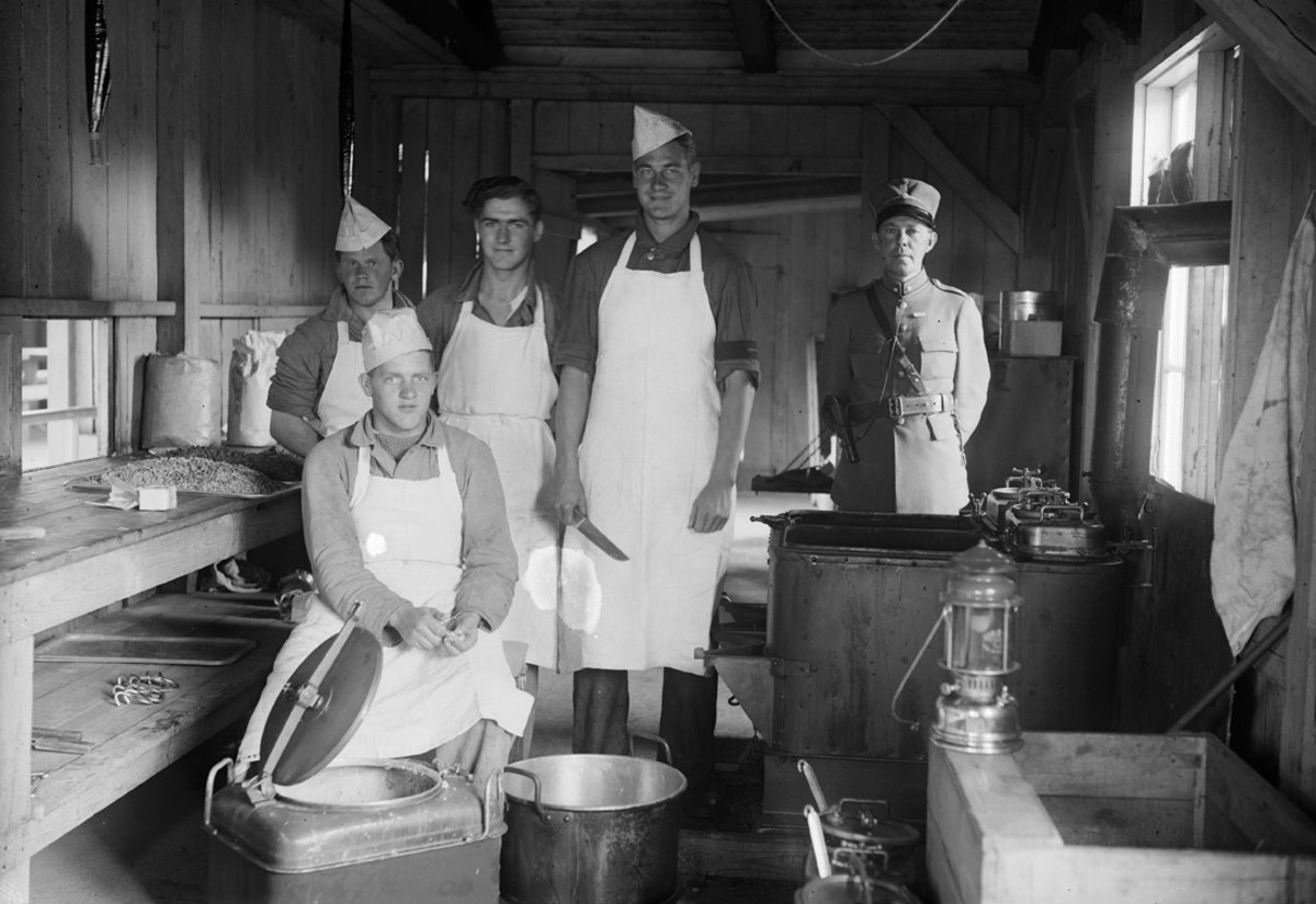 Kökspersonalen i Rinkaby. Fyra män samt en militär på plats i köket.
