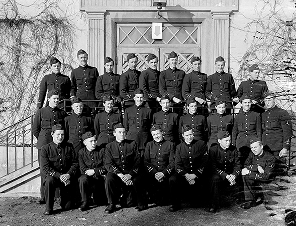 Grupporträtt av elever vid korpralskolan på F 2, 1944. Flygplansmekaniker vid trappa.