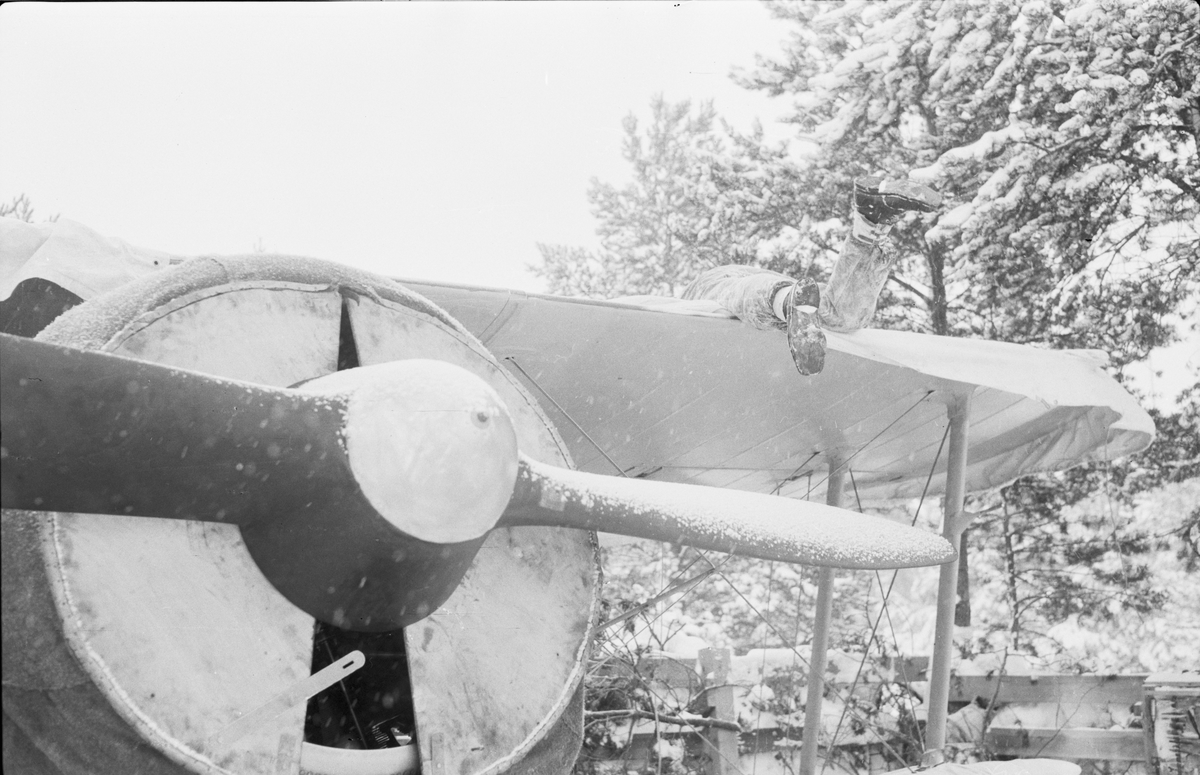 Flygplan Gloster Gladiator med vingkapell och motorkåpa vid Svenska frivilligkåren i Finland, F 19. En militär hänger över vingen för att sätta på kapellet.