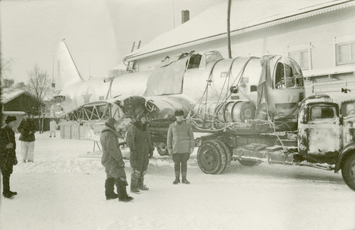 Sovjetiska flygare (i mörka overaller) som tagits som krigsfångar efter att ha skjutits ned i flygplan DB-3. Vid Svenska frivilligkåren i Finland, F 19. Flygplanet lastat på vagn efter lastbil. Militärer kring flygplanet.