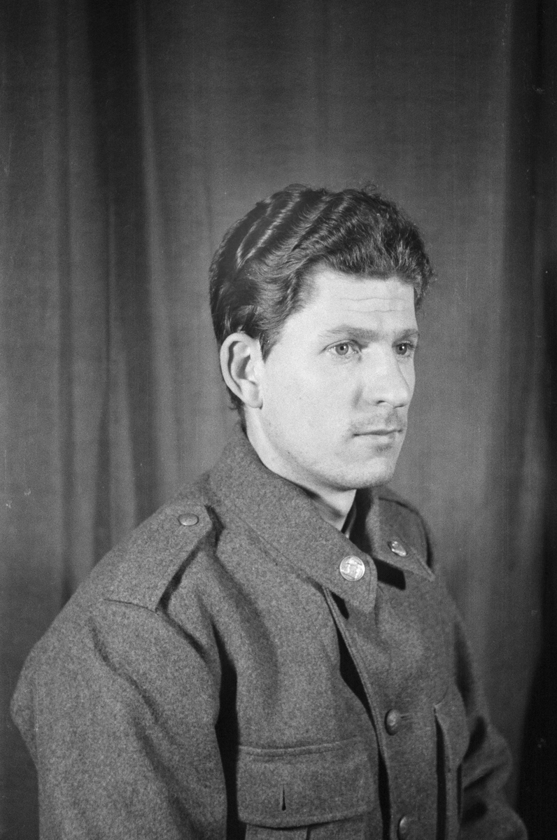 Porträttfoto av soldat Lennart Eugen Karlsson (nummer 3693), mekaniker vid F 19, Svenska frivilligkåren i Finland under finska vinterkriget, 1940.