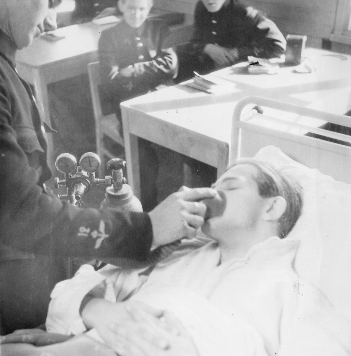 Övning i syrgasgivning under sjukvårdskurs på F 11 Södermanlands flygflottilj, 1945. En soldat i arbete vid patieint i sjuksäng i skolsal. Elever i skolbänkar i bakgrunden.
