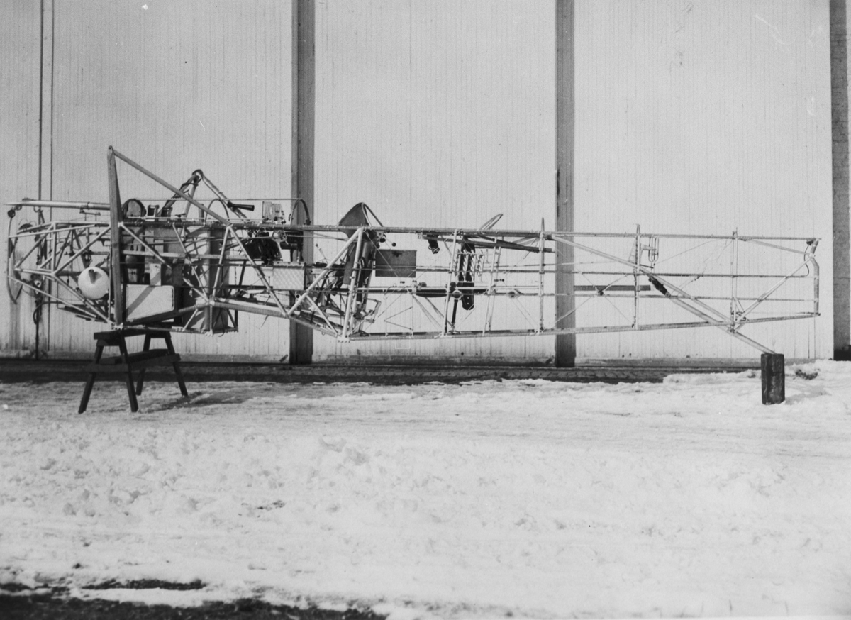 Stomme till flygplan S 6 Fokker står uppställt på bock utomhus, vintertid.