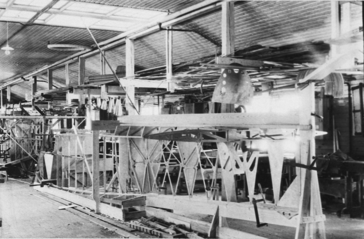 Interiör av snickarverkstaden vid Flygkompaniets verkstäder på Malmen, 1920-tal.