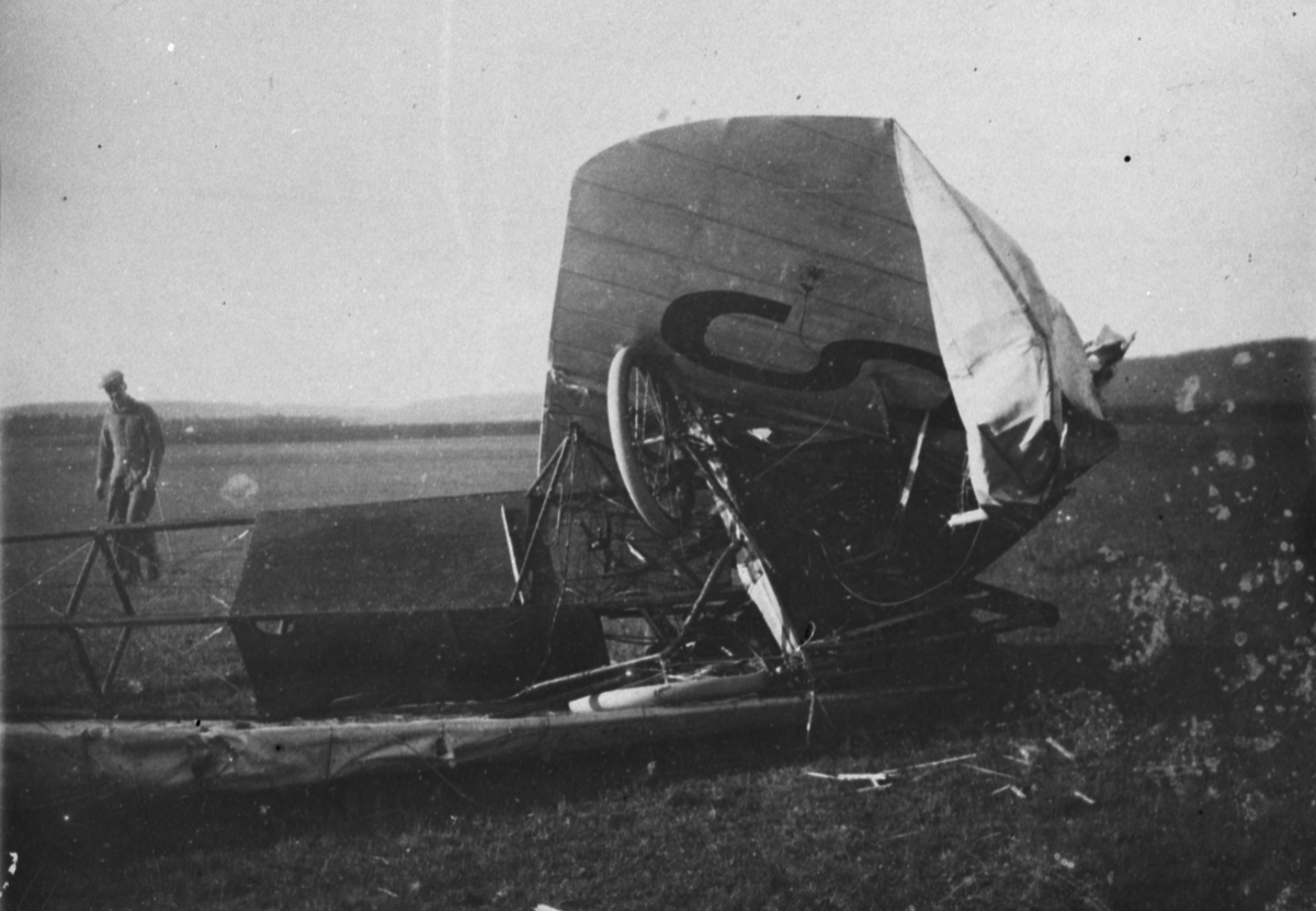 Närbild av ett havererat flygplan Thulin A på ett flygfält.