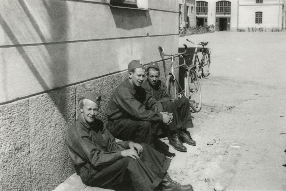Tre soldater sitter vid en kasernbyggnad i Umeå, 1940.