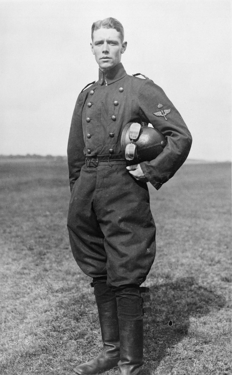 Porträttfoto av löjtnant Nils Rodéhn ståendes på ett flygfält omkring 1918-1919.