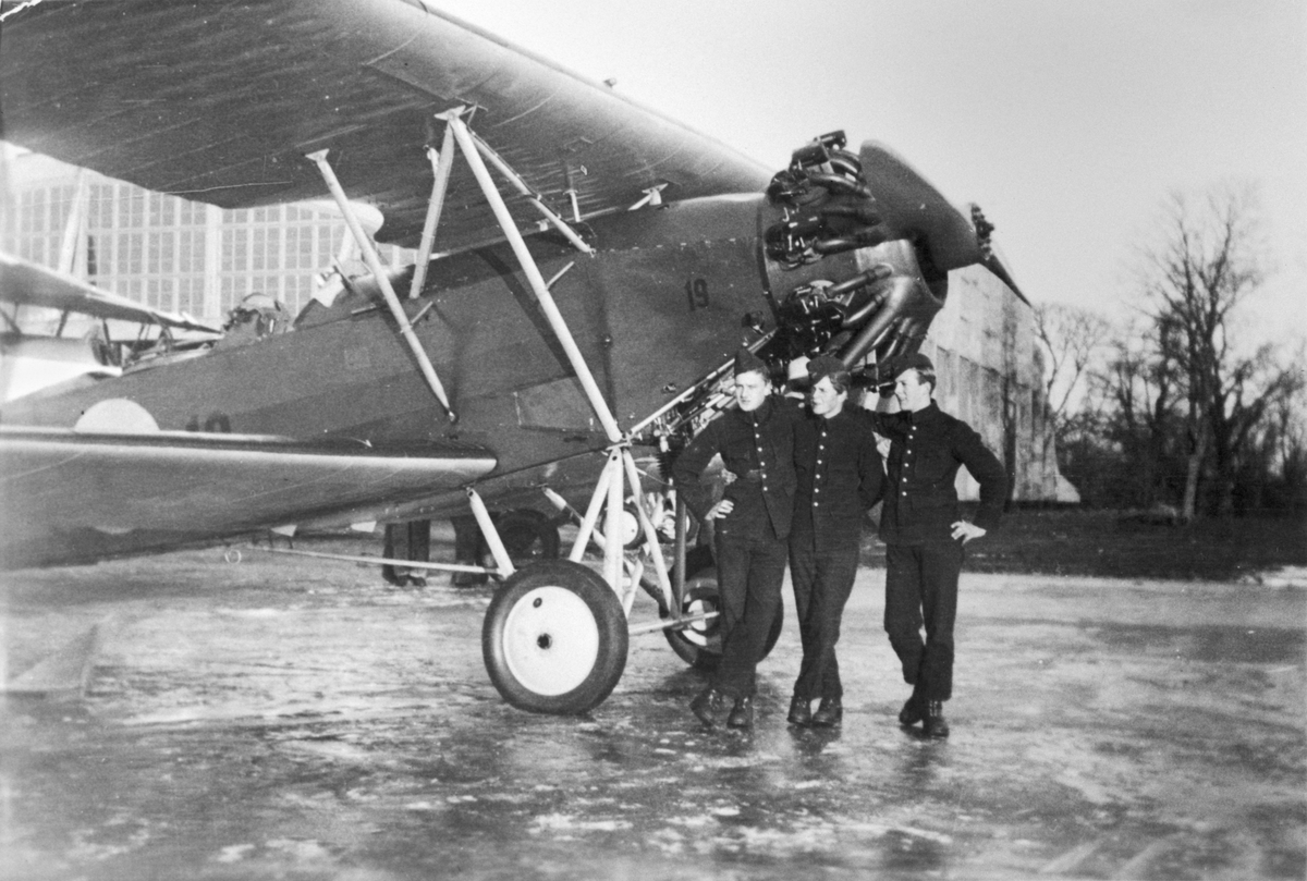 Tre volontära flygsoldater står vid flygplan S 6, Fokker C. V. framför hangar, vintertid, 1937.