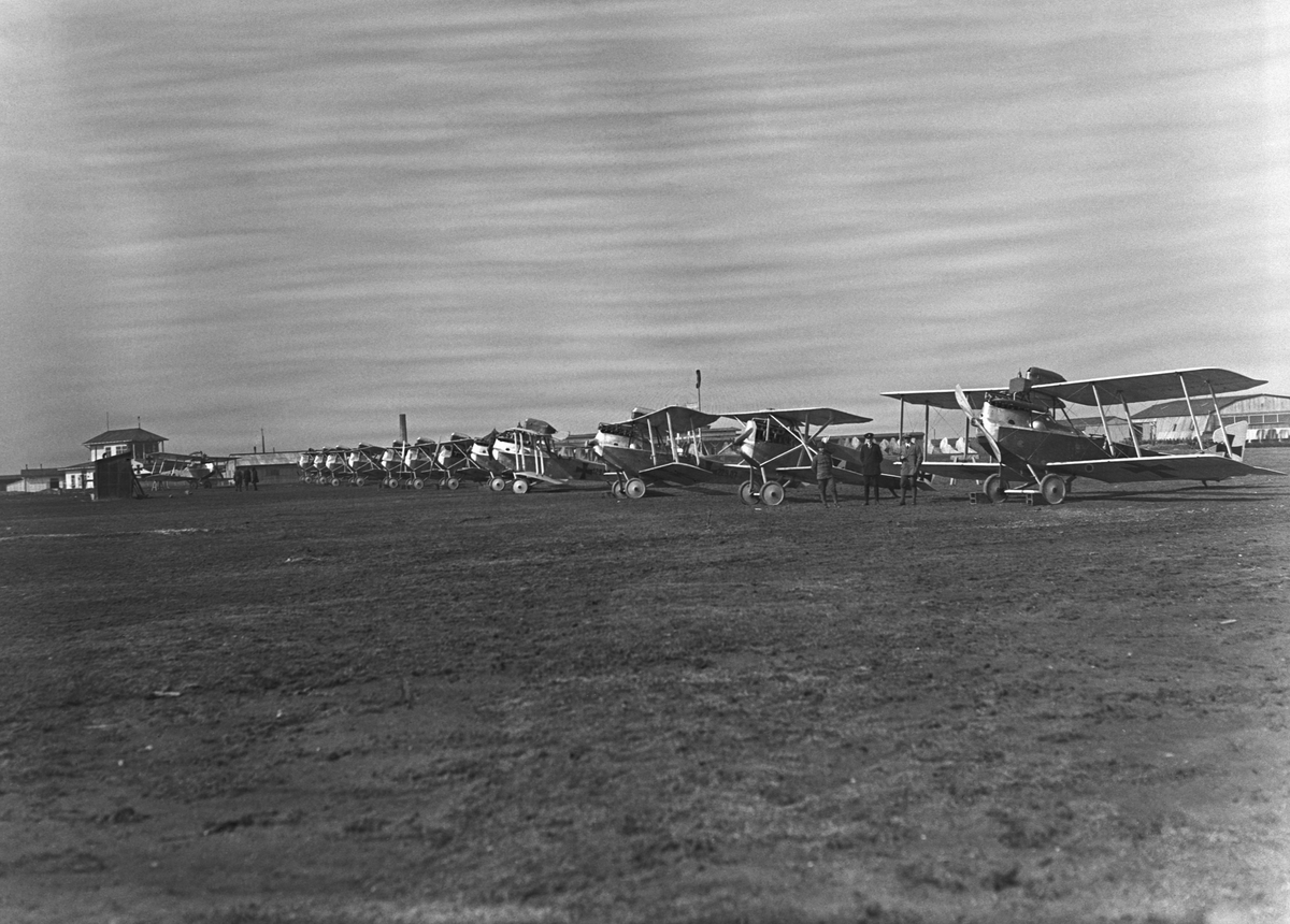 Översikt av flygfältet vid Wiener-Neustadt, Österrike-Ungern under första världskriget. Militära flygplan på fältet.