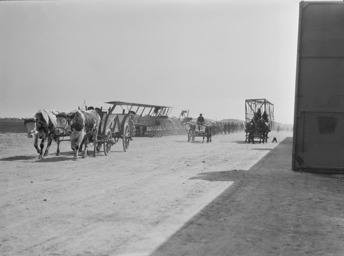 Två ekipage oxar med vagn samt ett hästekipage kör förbi ett militärt flygfält i Österrike-Ungern under första världskriget. Militärer samt flygplan Lohner B i bakgrunden.