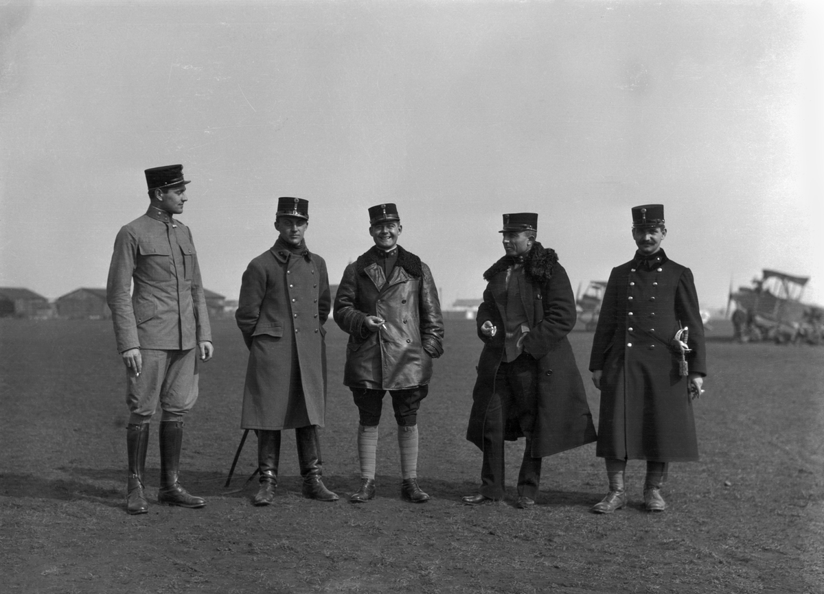 Gruppfoto av fem militärer från Österrike-Ungern på ett flygfält under första världskriget. Flygplan i bakgrunden.