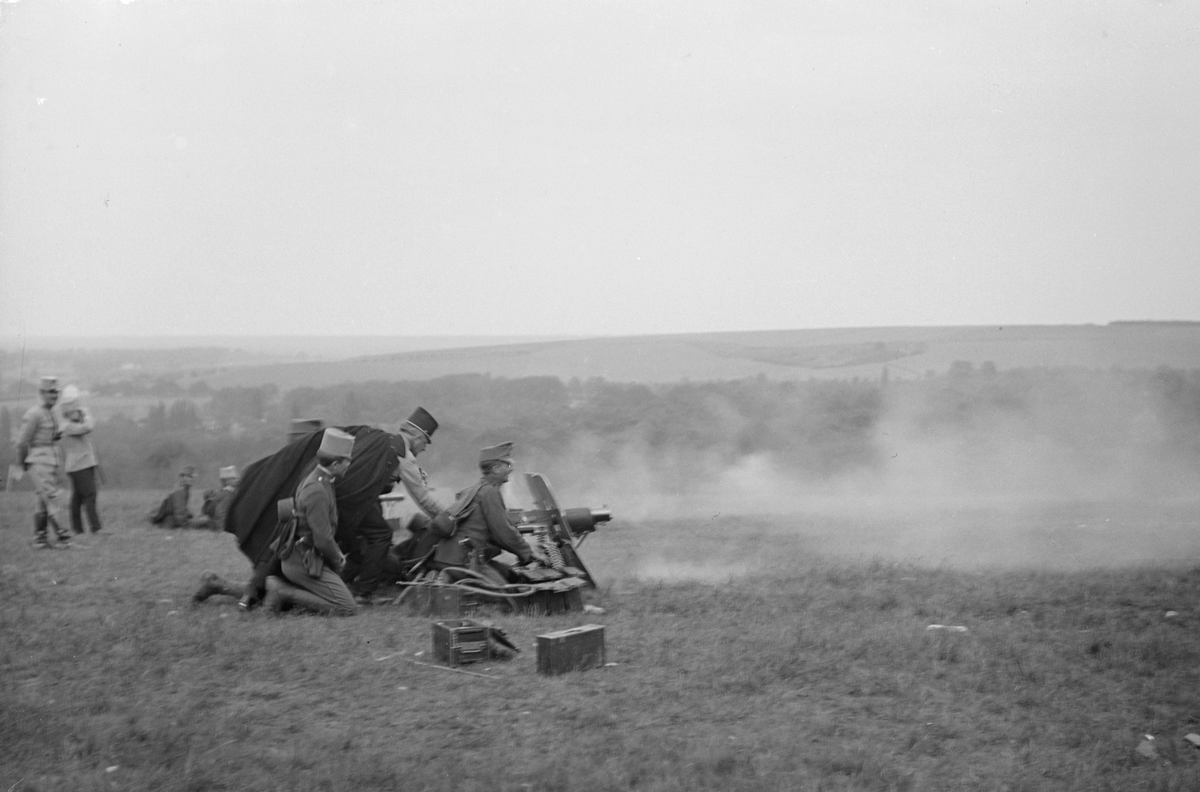 Övning. Skjutning med kulspruta i fält av militärer från Österrike-Ungern cirka 1914-1915.