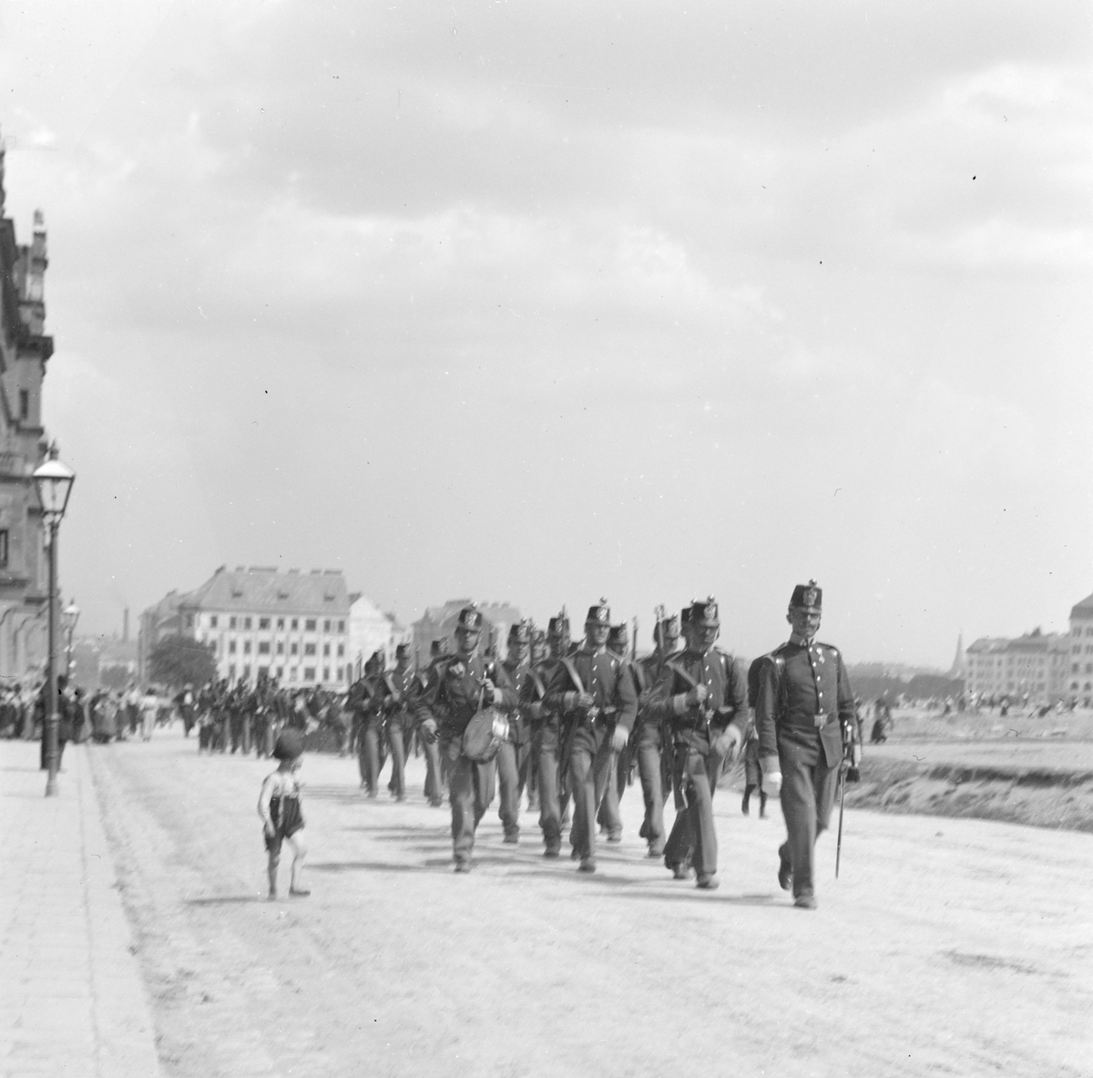Militär musikparad i Wien, cirka 1914-1915. En pojke går bredvid paraden.