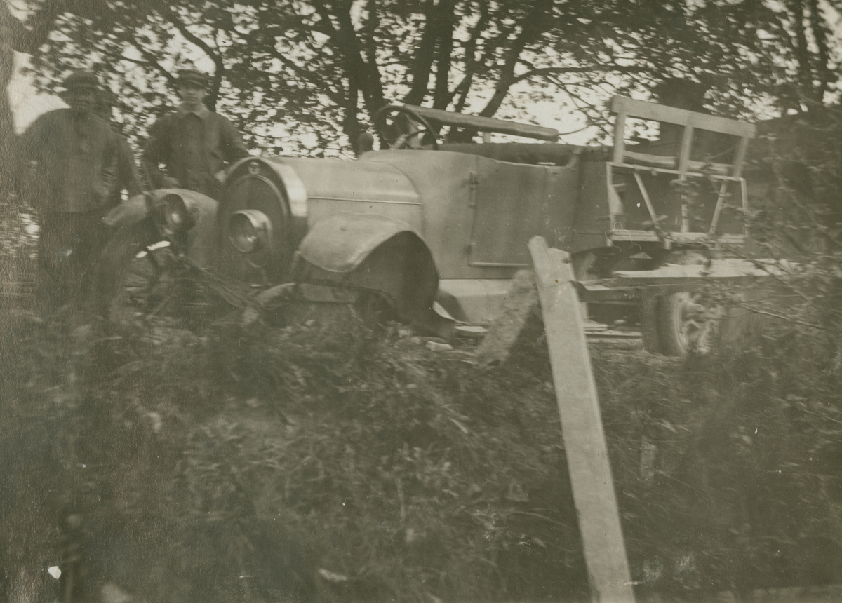 En militär bil tillhörande Flygkompaniet på Malmen har kraschat in i buskage, omkring 1919-1920. Två män står bredvid.