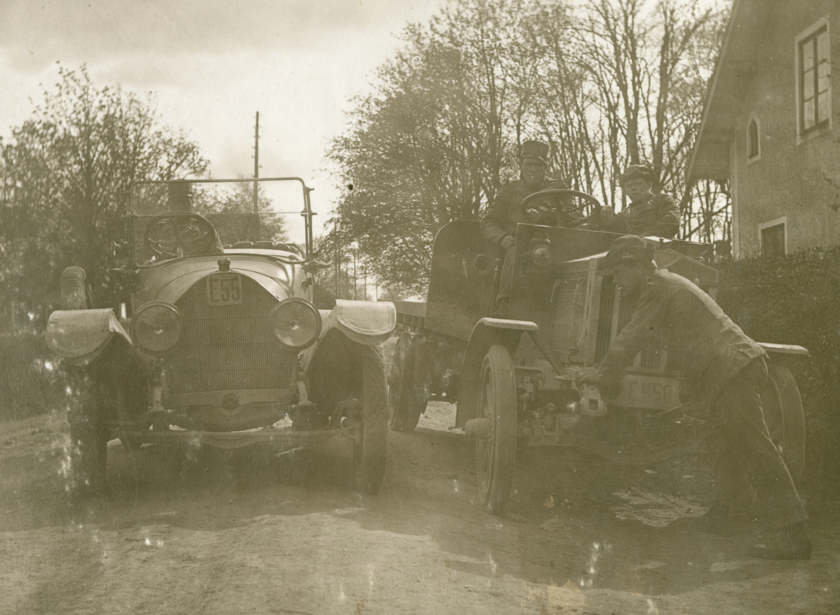 Militärer vid militär bil och militär lastbil på en väg på Flygkompaniet på Malmen, omkring 1919-1920. Fyra militärer vid fordonen. Med registreringsnummer E55 och E450. T