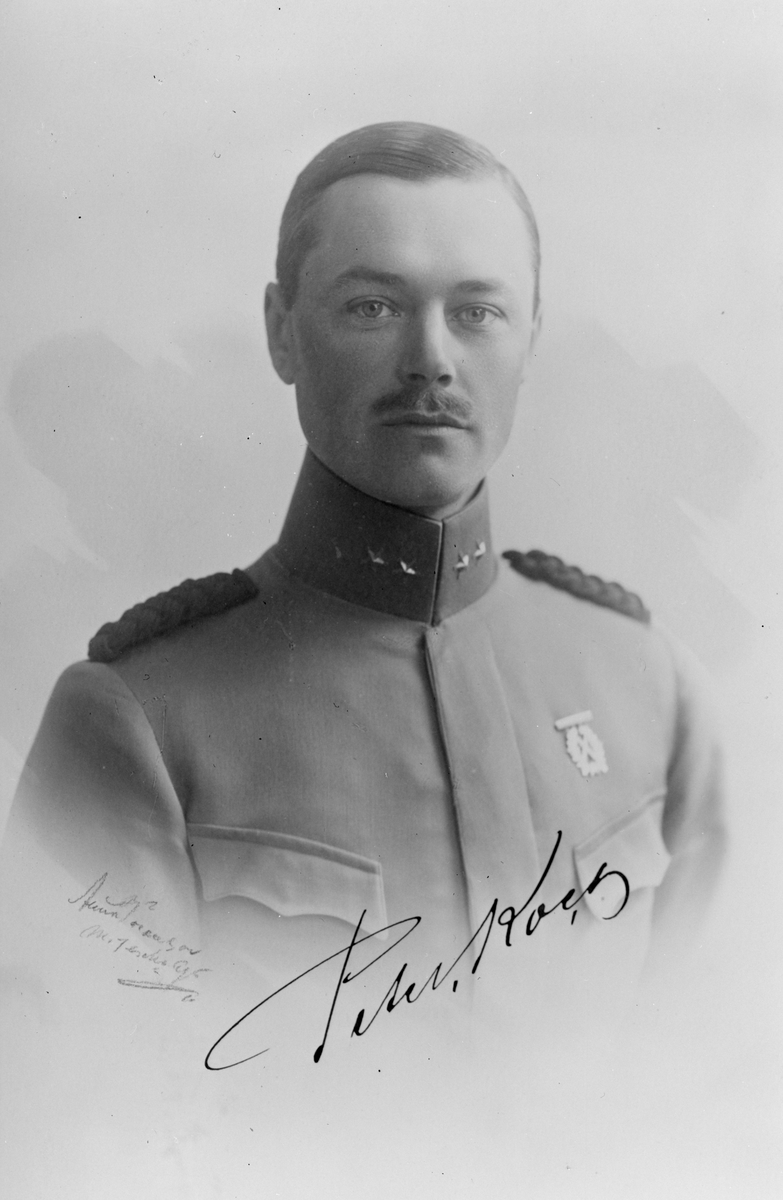 Porträtt av militären Peter Koch, chef för Flygkompaniets verkstäder i Malmslätt, från Kungliga fortifikationen. Porträttet är signerat av Koch.