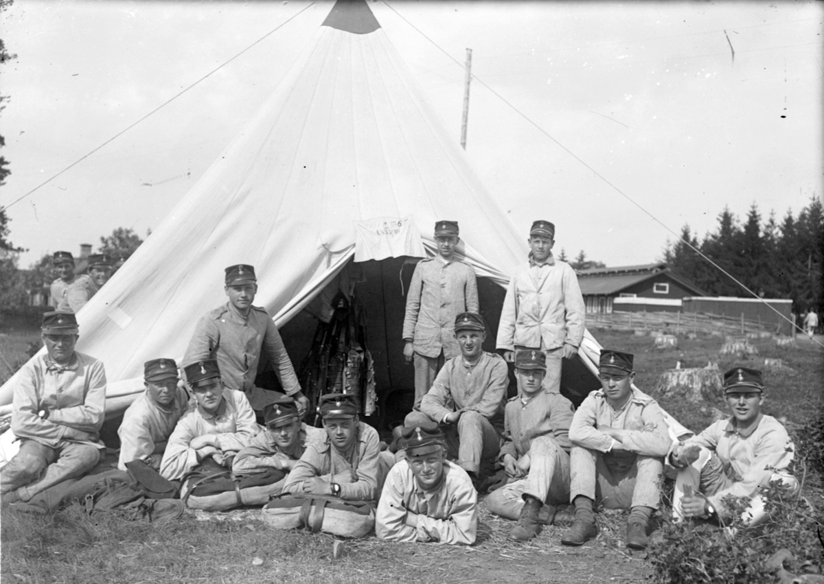 Titel: Grupporträtt. Armésoldater från I 4 och / eller I 5 regemente samlade vid lägertält.