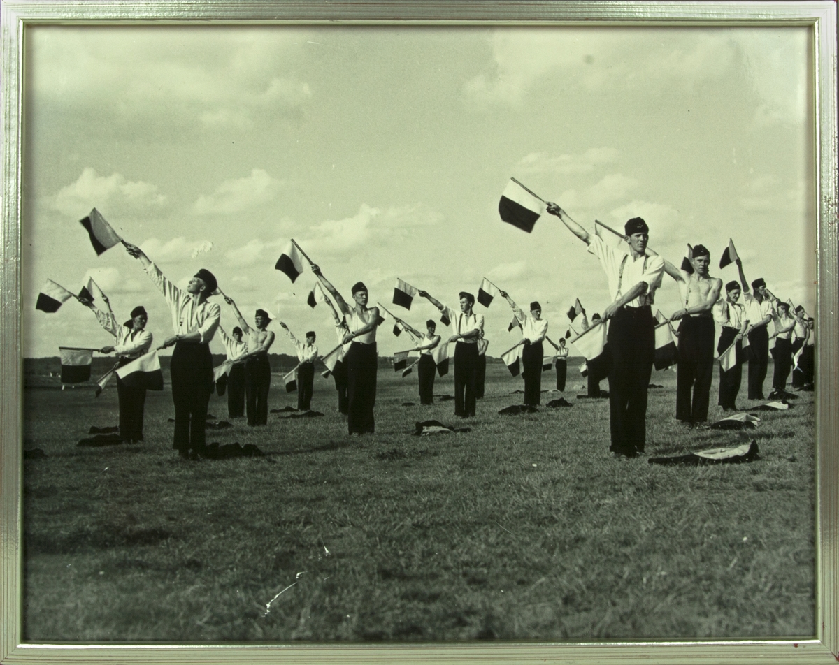 Signalering ASP-AVD på F 5 i Ljungbyhed, 1937. Värnpliktiga män övar signalering med flaggor mot flygplan. Inramat foto.