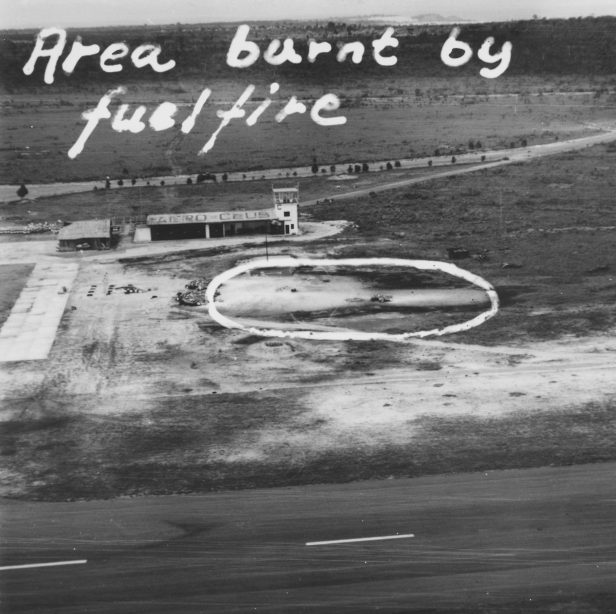 Flygspaningsbild av flygstation i Kongo, taget av F 22 under Kongokrisen 1962-1963. Med påritad information "Area burnt by fuelfire"