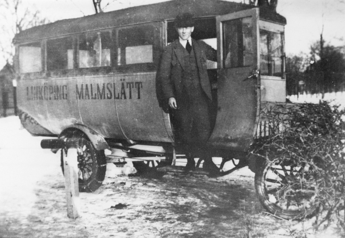 Trafikbussen mellan Linköping och Malmslätt omkring 1915-1935. Förare vid bussdörren.