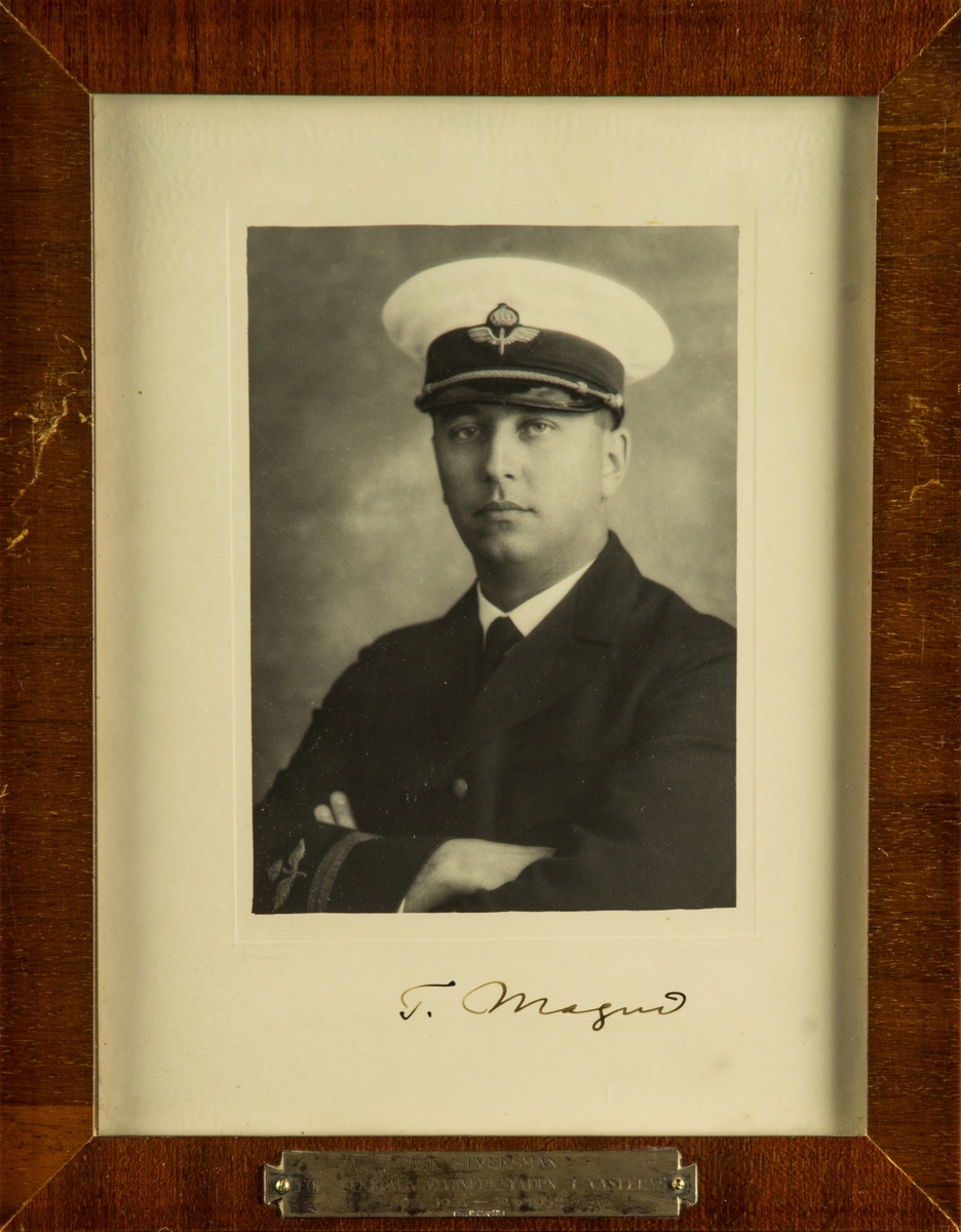 Porträttfotografi av Tore Magni, tjänsteförättande styresman för Centrala flygverkstaden i Västerås 1931-1932. Signerat, inramat foto.