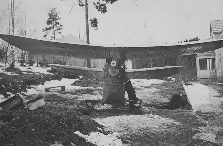 Flygplan Flygande Loppan med skidor under motorkörning, framifrån.