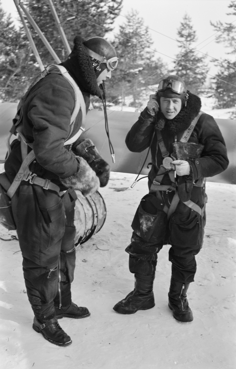 Två flygare tillhörande Svenska frivilligkåren i Finland, F 19, står i flygdräkt framför flygplan Hawker Hart. Till höger Adolf Svartz.