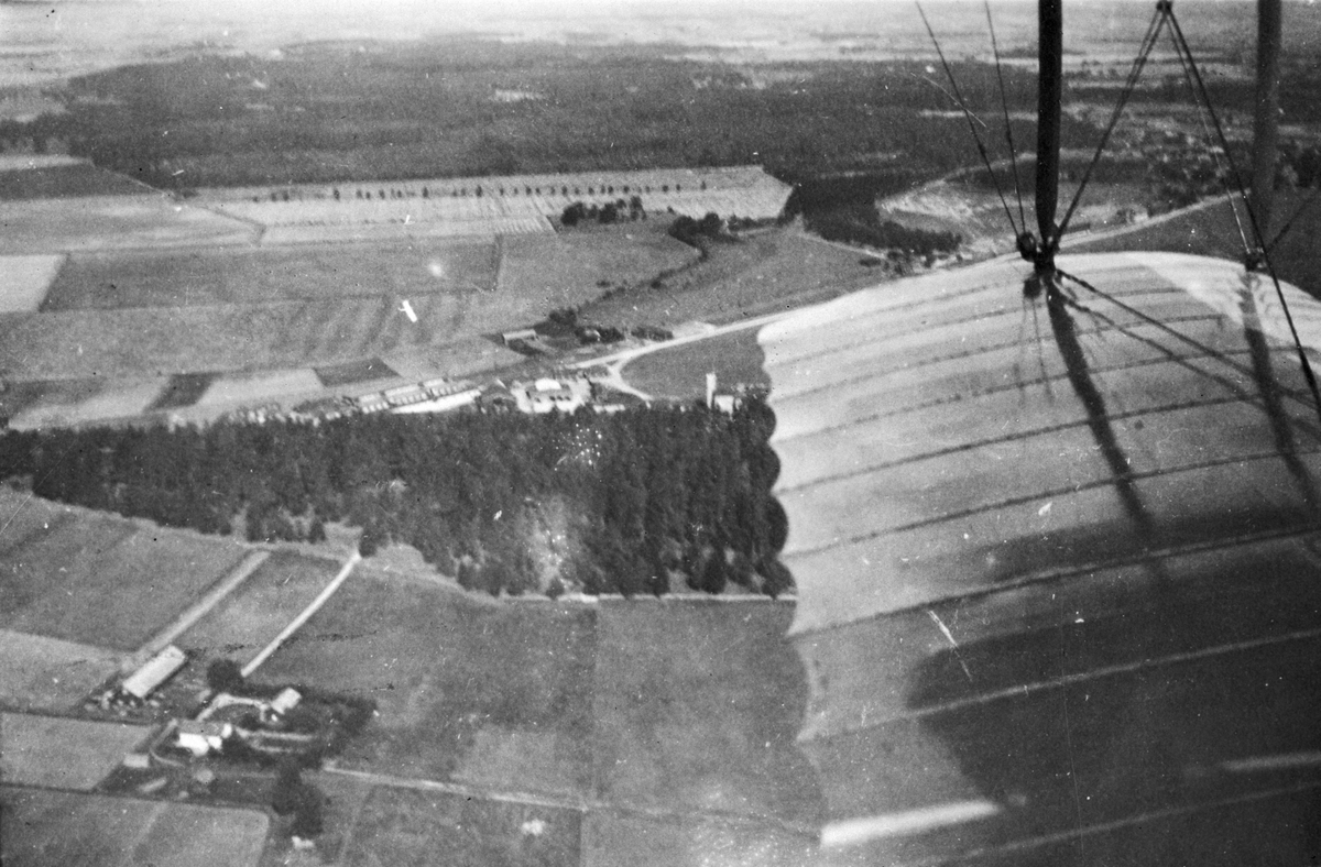 Flygfotografi mot Malmslätt från flygplan Albatros. Flygkompaniet på Malmen vid skogspartiet. Omkring 1920-1925.