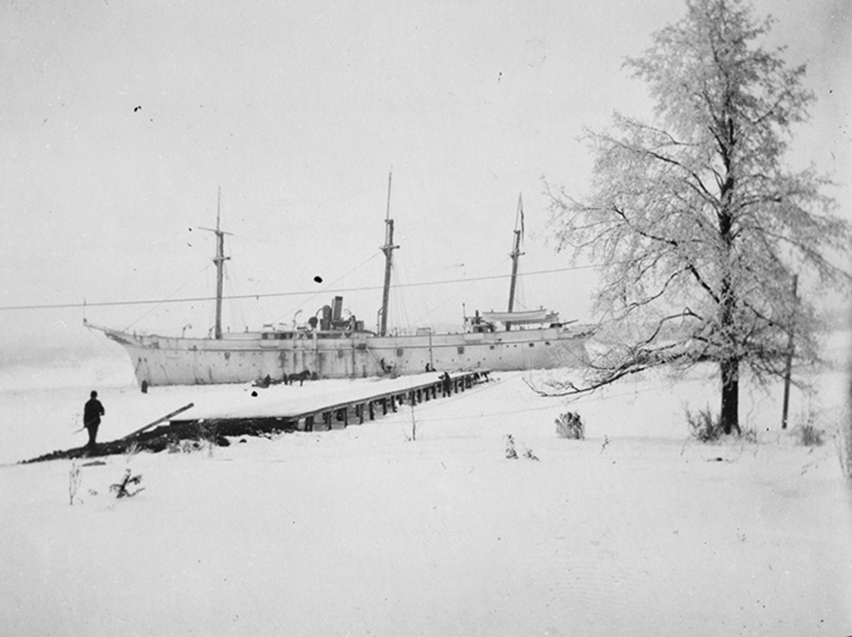 Logementsfartyget Freja, vid Hägernäs, vintertid. Personer och häst i arbete