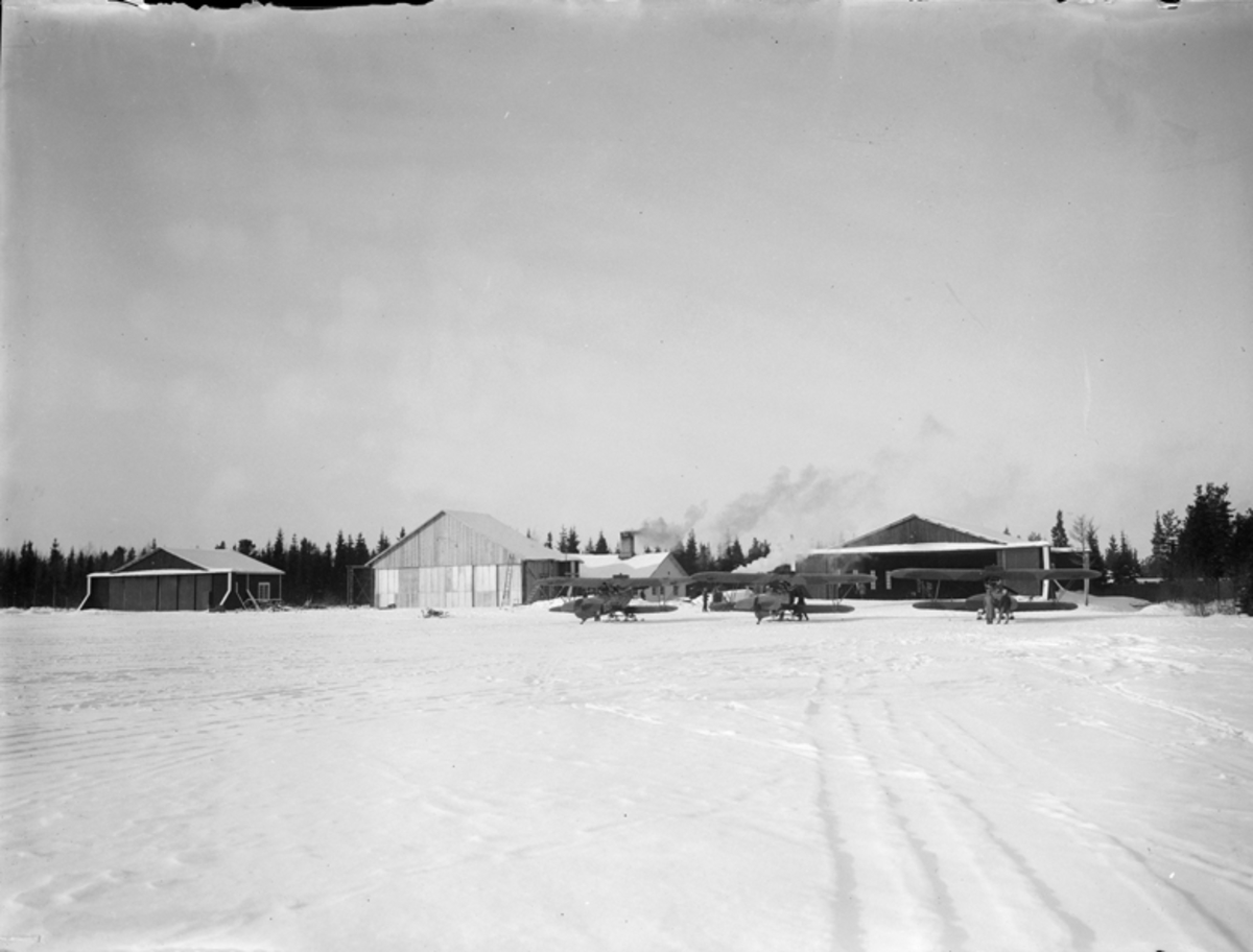 Flygstationen i Boden. Tre flygplan framför byggnader.